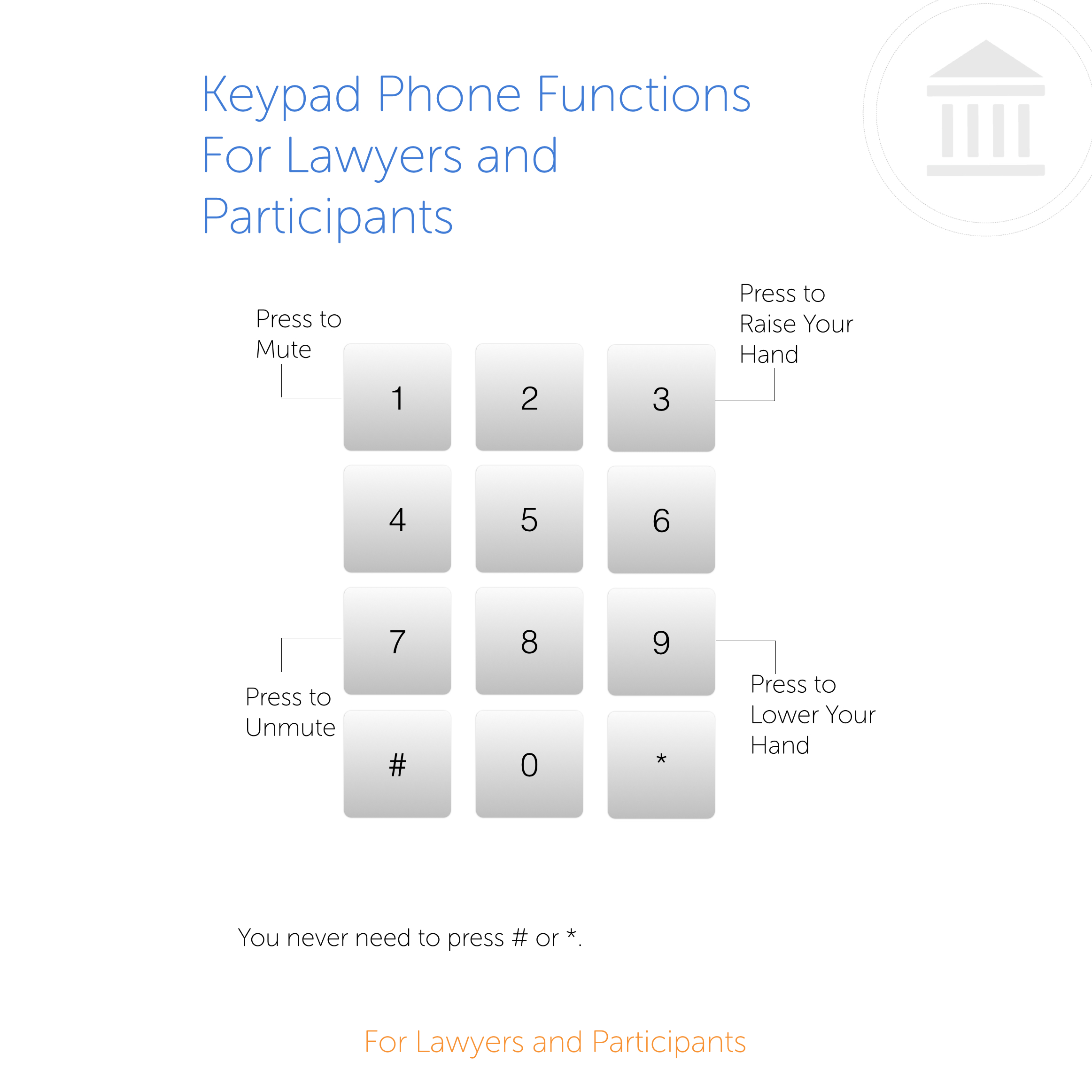 If you are a lawyer or a participant, you will also have a functional conference call experience without using the Hearing Dashboard. You will not, however, be able to retrieve or submit documents through the Document Dashboard, or mute/unmute yourself without the Hearing Dashboard.